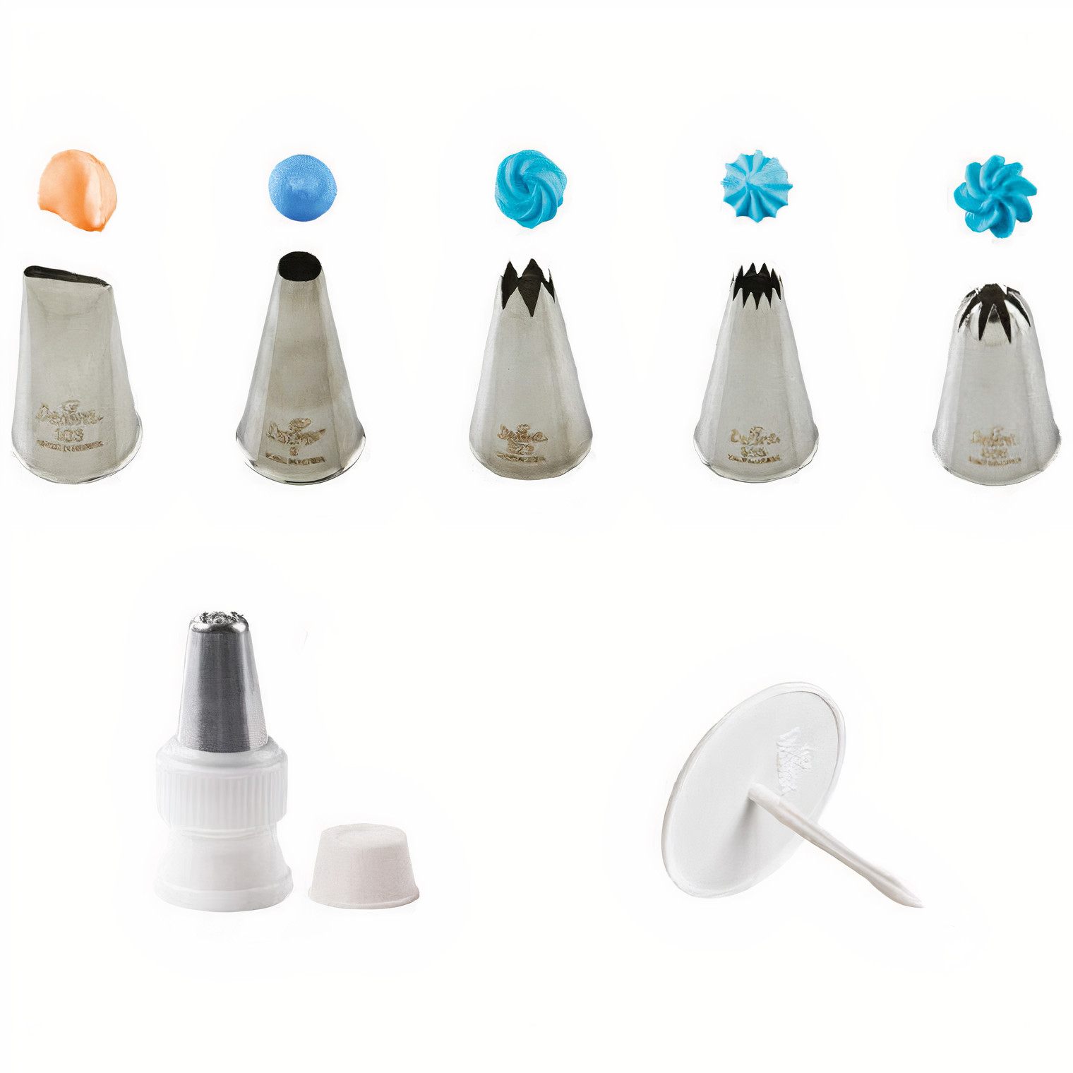 - De set bevat: 1 adapter met dop, 1 grote bloemhouder, spuitmondjes nummers 103, 9, 823*, 863/4B*, 856/1C* (*te gebruiken zonder adapter).
