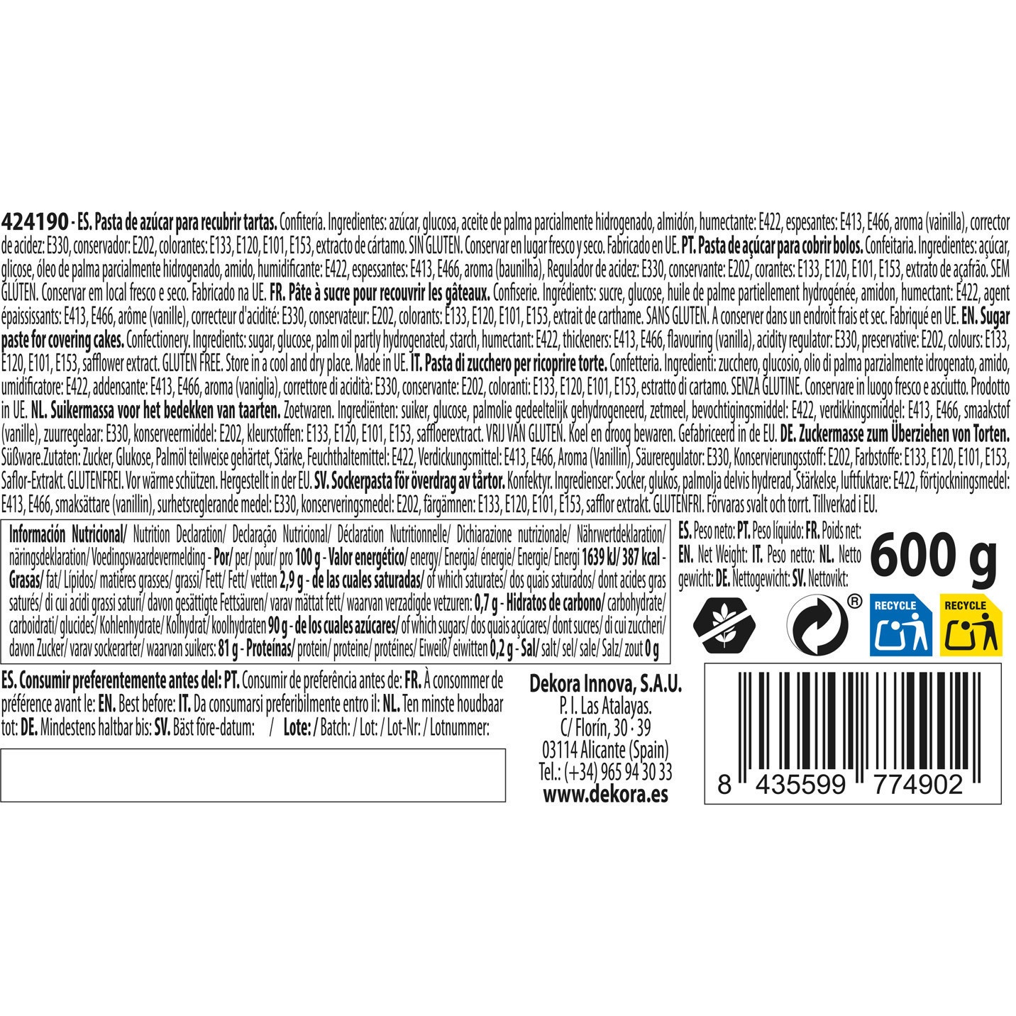 Ingrediënten: Gedeeltelijk gehydrogeneerde plantaardige olie, Zetmeel, Aroma (vanille), Suiker, Saffloerextract, Glucose, Kleurstoffen: E101, E120, E133, E153, Verdikkingsmiddel: E413, E466, Bevochtiger: E422, Zuurteregelaar: E330, Conserveermiddelen: E202.