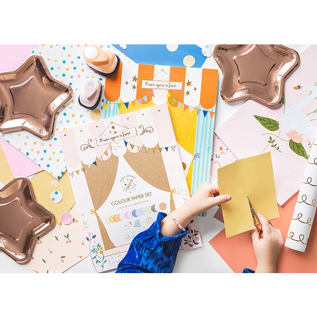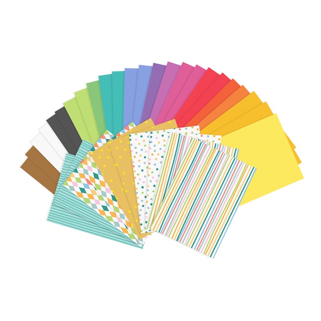 Pakket bestaande uit 34 geassorteerde DIN A4-formaat vellen in kleuren en patronen waarmee kinderen plezier kunnen hebben bij het knutselen.