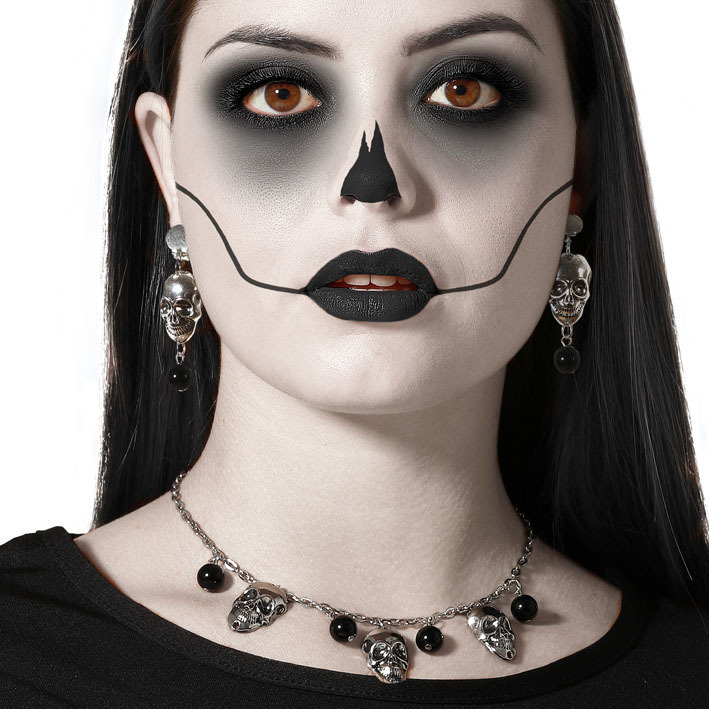 • Ketting met hanger van zilveren schedels en bijpassende oorbellen. Perfect voor gotische stijlen, heksen of elegante dood.