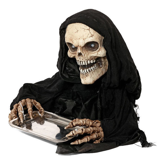 - Houdt een dienblad voor snoep of drankjes vast en beschikt over licht- en geluidseffecten die je gasten zullen verrassen.