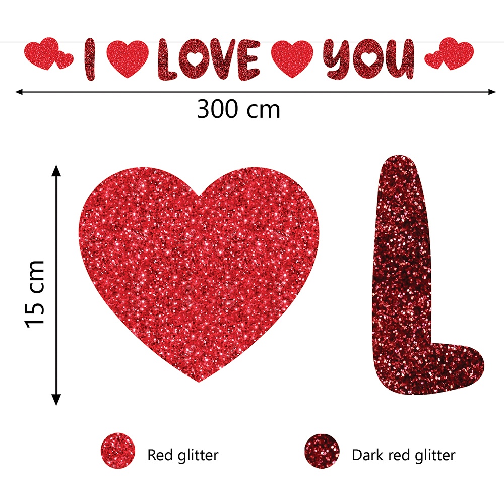 Papieren slinger "I love you" met uitgesneden letters en hartjes in een glanzende, glitterende afwerking. Ontworpen om een romantische sfeer te creëren tijdens Valentijnsdag, intieme diners en bijzondere gelegenheden. Totale lengte ca. 300 cm en hartjes van ongeveer 15 cm voor een zichtbare uitstraling aan muren of boven het bed. Licht en eenvoudig op te hangen dankzij het ophanglint; geeft een elegante en feestelijke touch in rood met glittereffect.