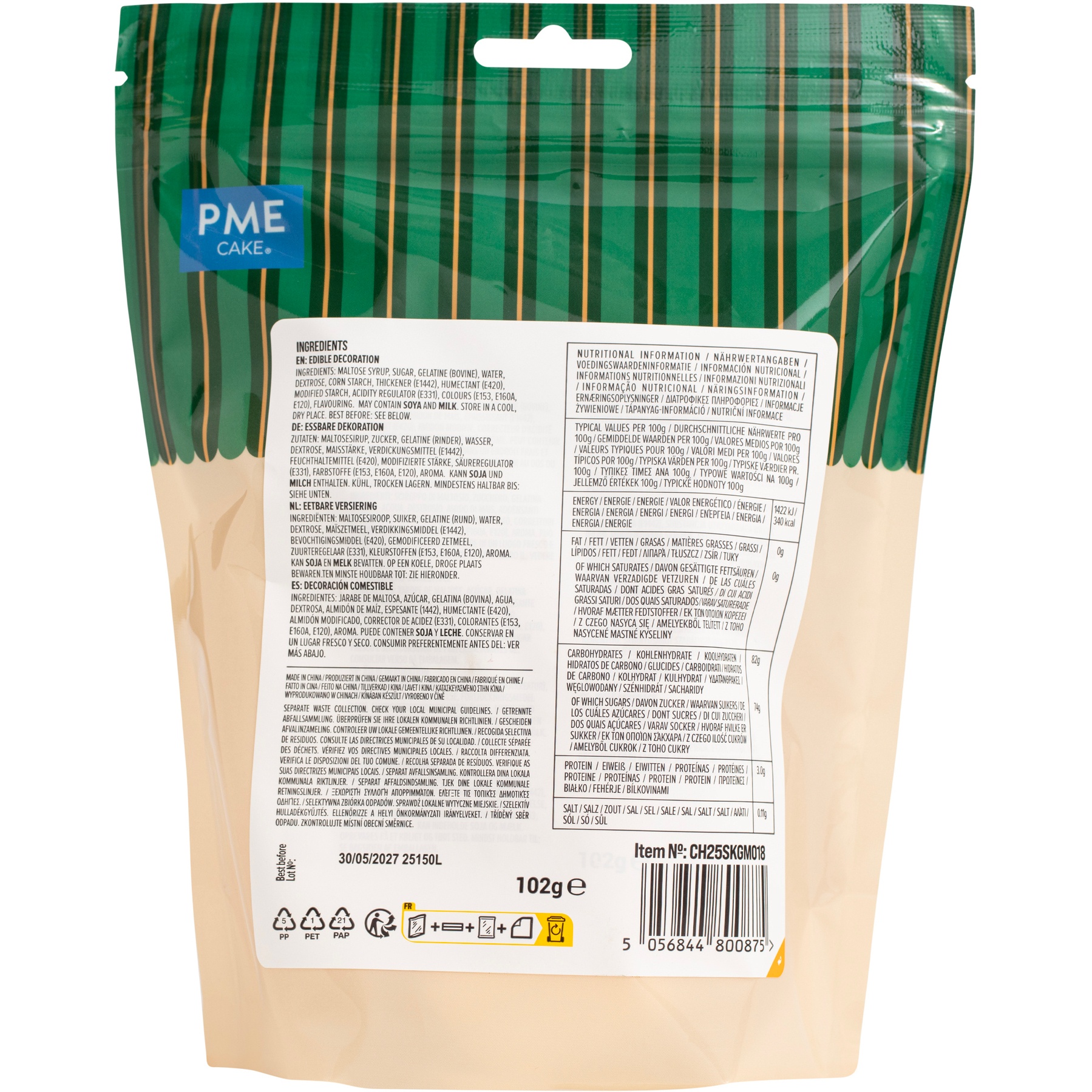 Ingrediënten: maltosesiroop, suiker, gelatine (rund), water, dextrose, maïszetmeel, verdikkingsmiddel (1442), vochtinbrengend middel (E420), gemodificeerd zetmeel, zuurteregelaar (E331), kleurstoffen (E153, E160A, E120), aroma.