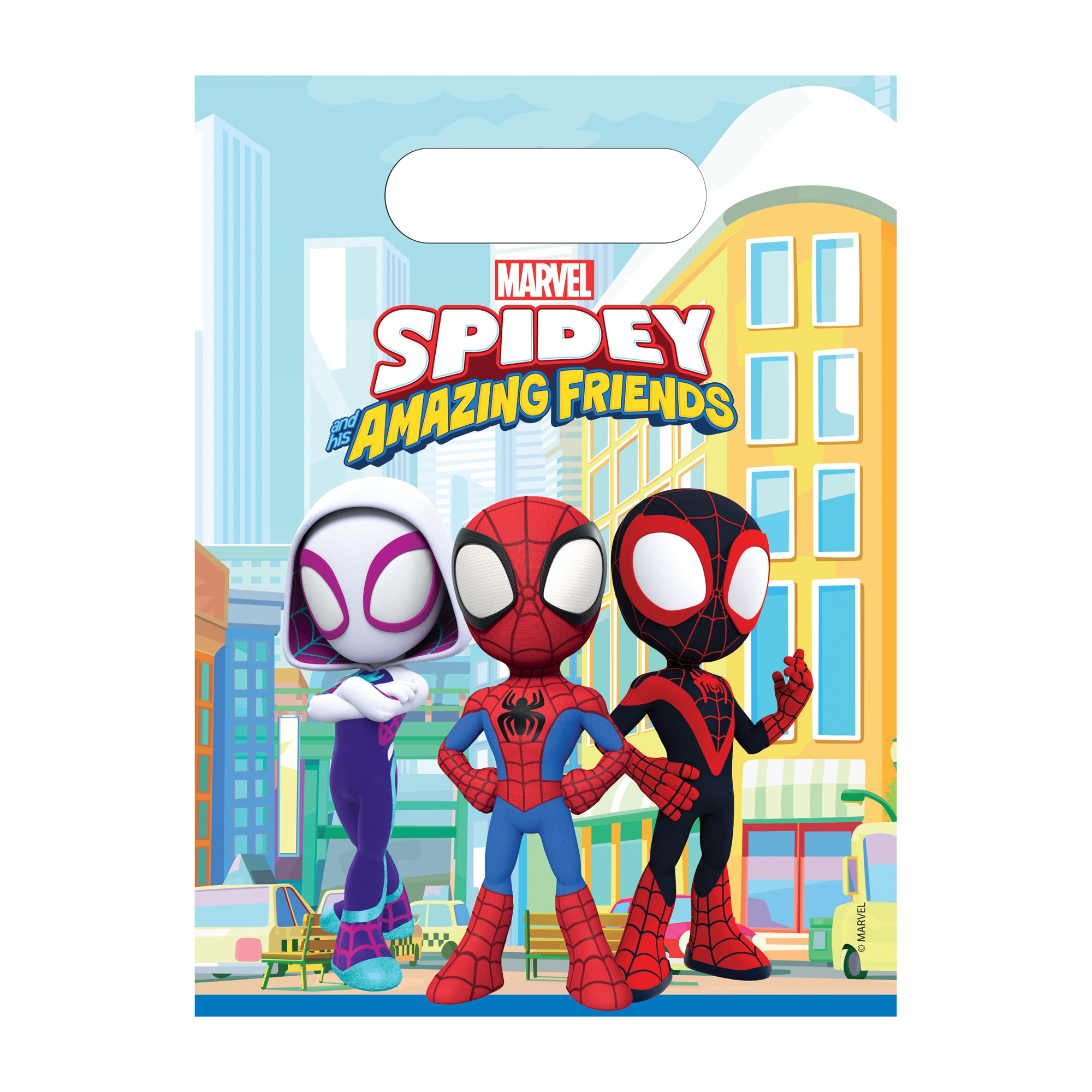 Set zakjes met het vrolijke ontwerp van Spidey en zijn vrienden, ideaal om de kleintjes te verrassen. Kleurrijke illustraties en herkenbare personages die elk kinderfeestje opfleuren. Uitgestanste handgreep voor comfortabel meenemen en eenvoudig uitdelen. Een product dat is ontworpen om het organiseren van feestjes en traktaties gemakkelijker te maken.