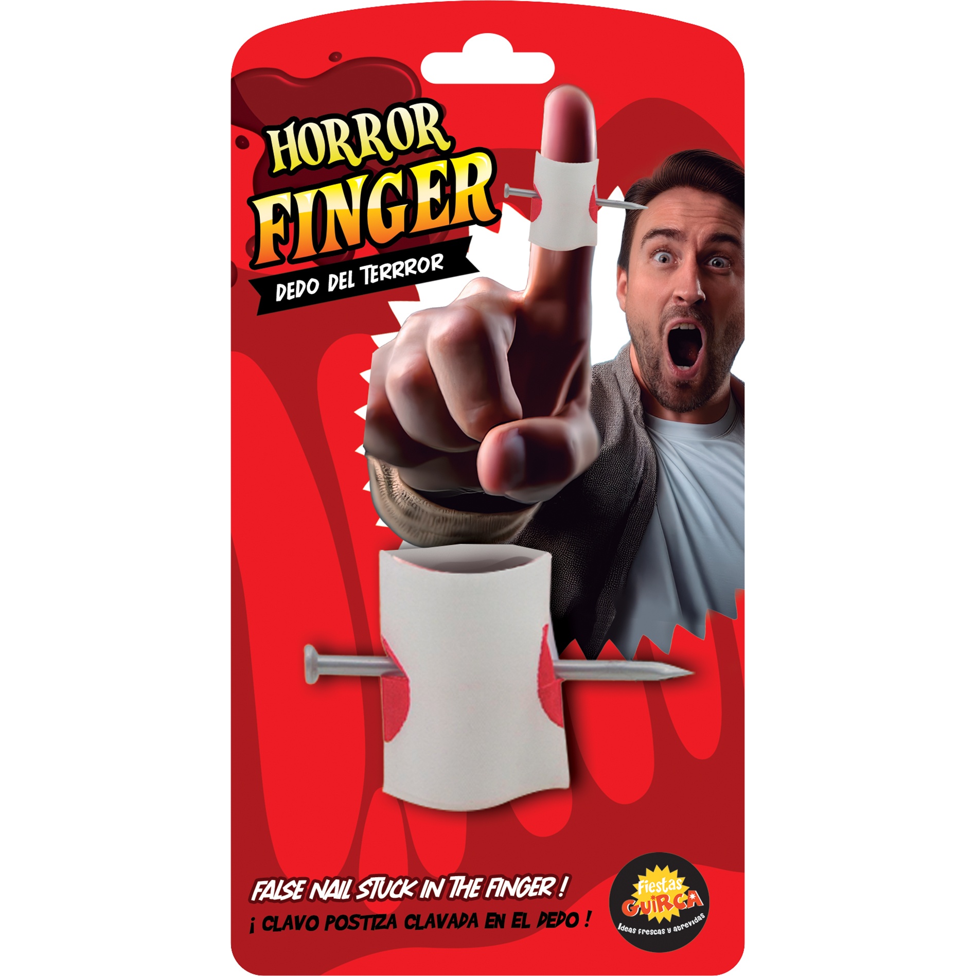 - Ultra-realistisch effect: een spijker die eruitziet alsof hij door de vinger is gestoken.