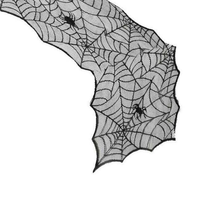• Zwarte kanten tafelloper met spinnenwebpatroon.