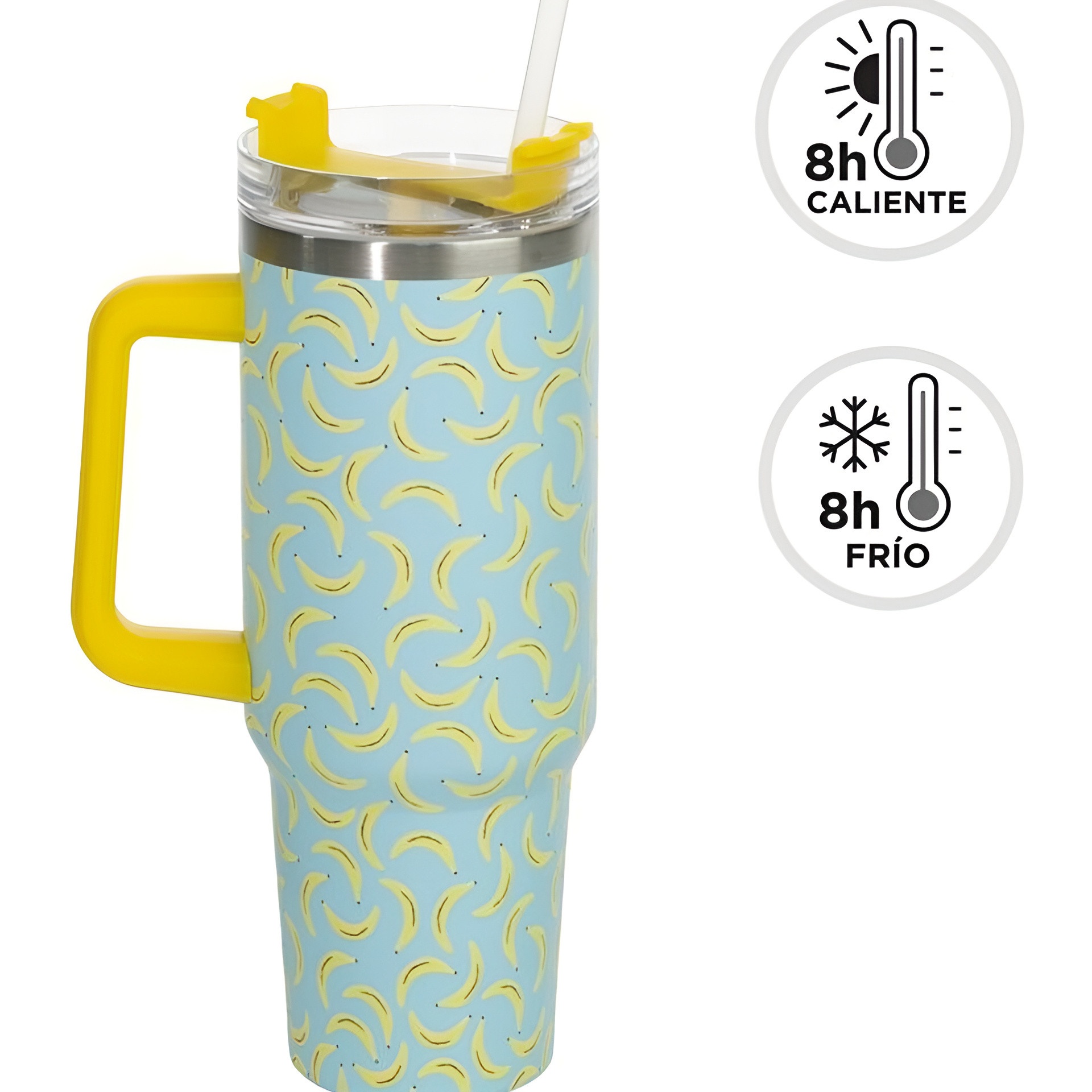 Kleurrijke afwerking met bananenprint voor een zomerse, ongedwongen uitstraling. Ideaal om drankjes mee te nemen gedurende de dag, in de auto of tijdens activiteiten buitenshuis.