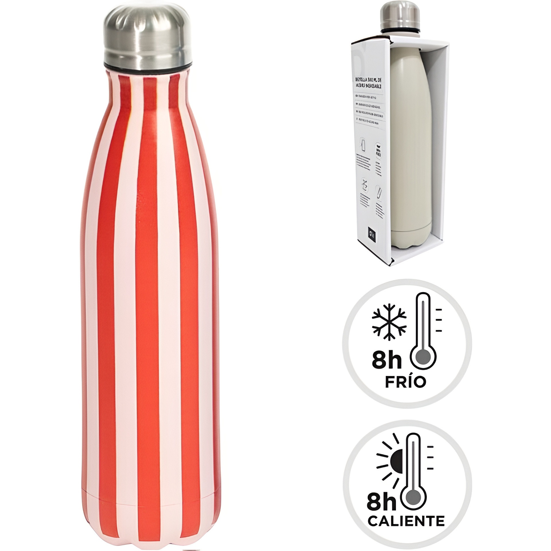 Gestreepte thermosfles die stijl en functionaliteit combineert. Door het compacte formaat en de lekvrije dop is hij ideaal om je favoriete drankje de hele dag bij je te hebben. Herbruikbaar ontwerp voor wie een praktische en karaktervolle keuze zoekt. Perfect voor je dagelijkse routine, tijdens het sporten of onderweg.