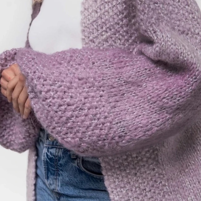 - Cardigan met bovendeel en manchetten in rijststeek en gepofte mouwen. Moeilijkheidsgraad gemiddeld.