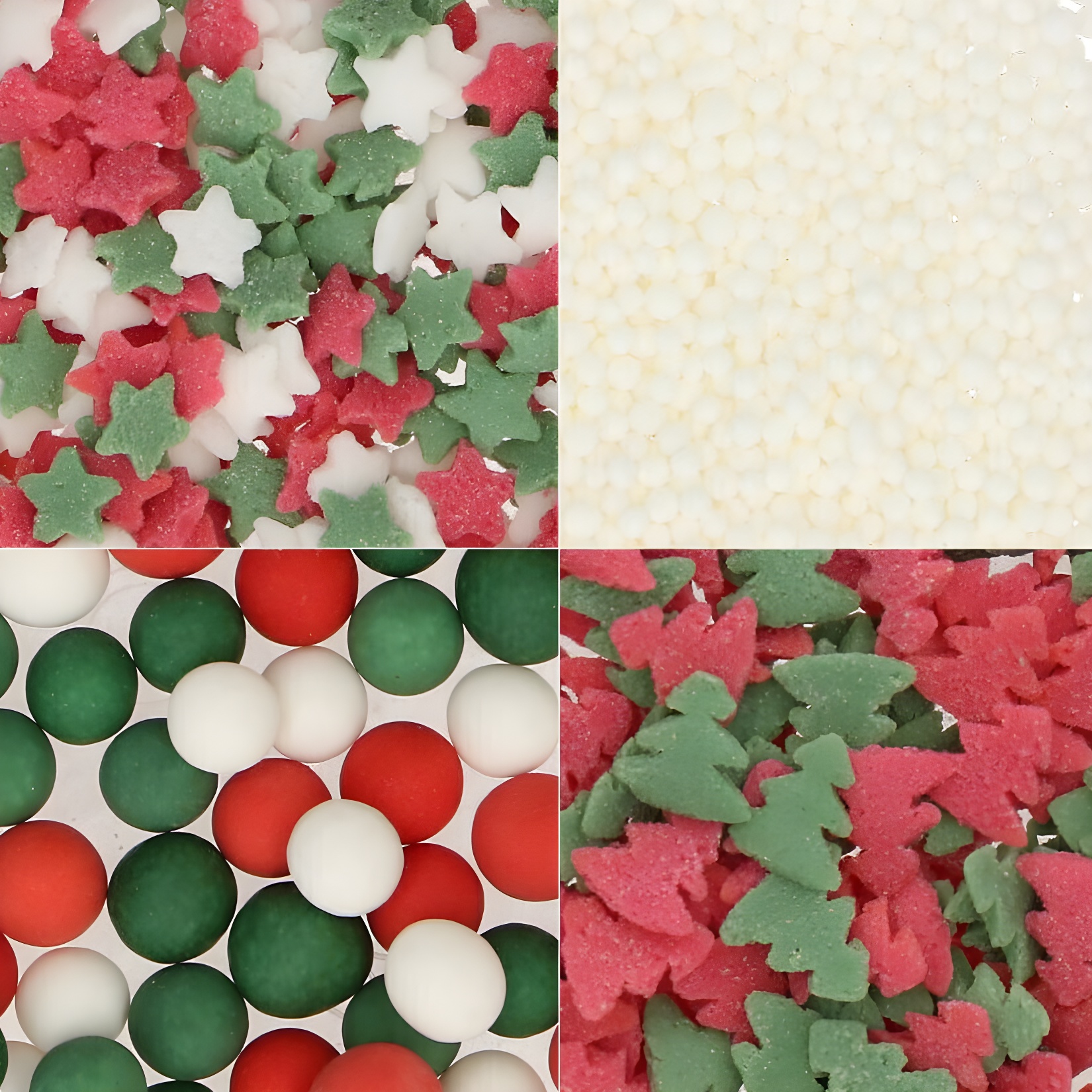 - Rode, groene en witte sterren, witte nonpareils, rode en groene kerstbomen, rode, groene en witte parels.