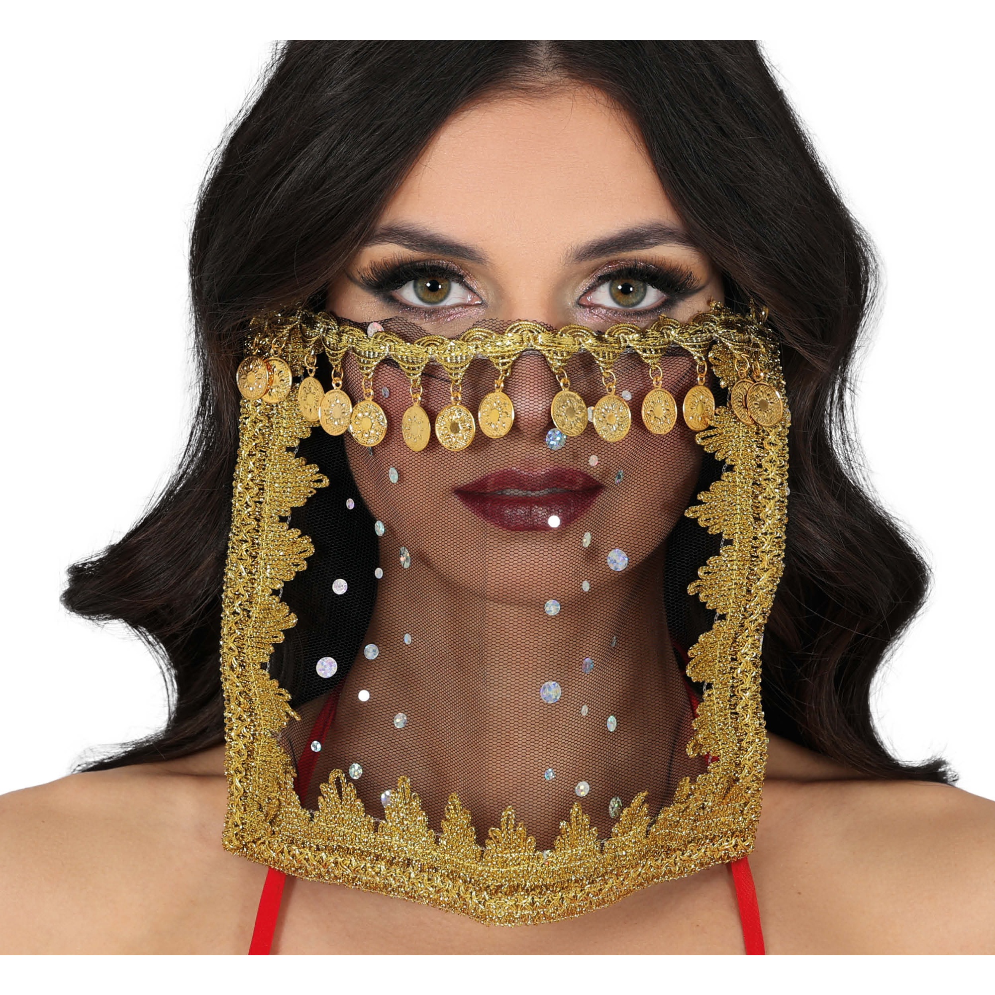 Elegante zwarte sluier, speciaal ontworpen voor buikdans en themafeesten. De halfdoorzichtige netstof is versierd met gouden details en muntjes die zowel beweging als klank toevoegen tijdens het dansen. De uitgewerkte gouden rand benadrukt elk kostuum en creëert een opvallend effect rondom het gezicht. Gemaakt van polyester, licht en comfortabel voor optredens en fotosessies. Wordt geleverd met een bijpassend masker dat het onderste deel van het gezicht bedekt - ideaal voor mysterieuze en oosterse looks.