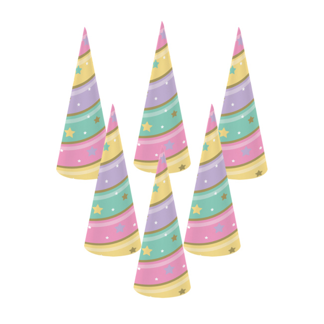 Ze zijn voorzien van een elastisch bandje om aan het hoofd te bevestigen. Ze zijn ontworpen met gekleurde strepen en verschillende maten sterren getekend rondom de hoed. Met dit detail zullen de kinderen hun eigen avonturen en spelletjes creëren. Plezier gegarandeerd.