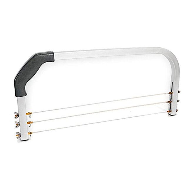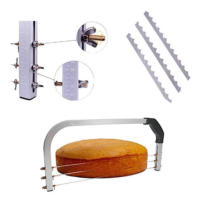 Professionele taartnivelleerzaag met 3 gegolfde draden die schoon en soepel snijden, voor perfecte nivellering. Makkelijk te gebruiken, met verstelbare hoogte om de dikte van de lagen te kiezen, en handvatten