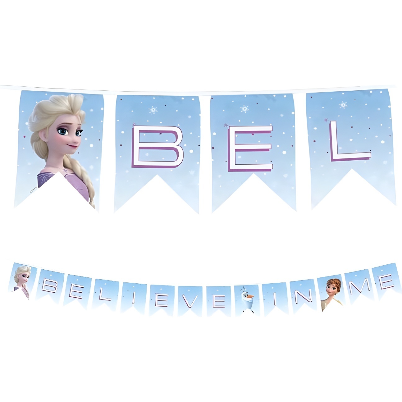 Herbruikbare vlaggenlijn met een Frozen-design, perfect om kinderfeestjes te decoreren met de personages Elsa, Anna en Olaf. De duidelijke letters vormen de tekst "Believe in Me" en de zachte kleuren met winterse details creëren een magische sfeer. Het lichte formaat maakt combineren met andere decoraties eenvoudig en geeft een sfeervol accent aan foto's en themabuffetten.