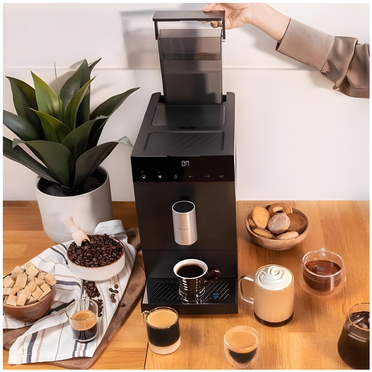 Mantenga el aparato fuera del alcance de los niños; no permita que jueguen con el panel, el depósito, la tolva de granos o las boquillas.