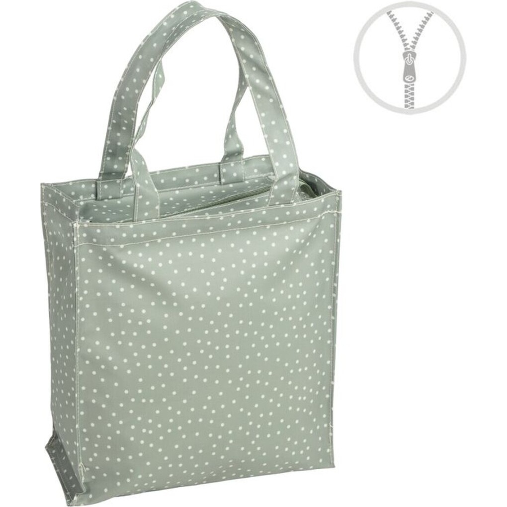 Tas met ritssluiting en gestippeld dessin in een zachtgroene tint, ontworpen om je spullen comfortabel en stijlvol mee te nemen.