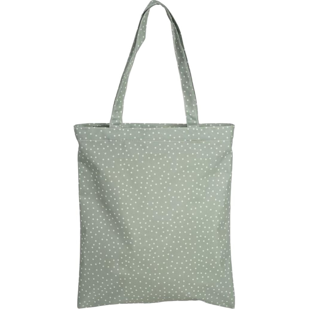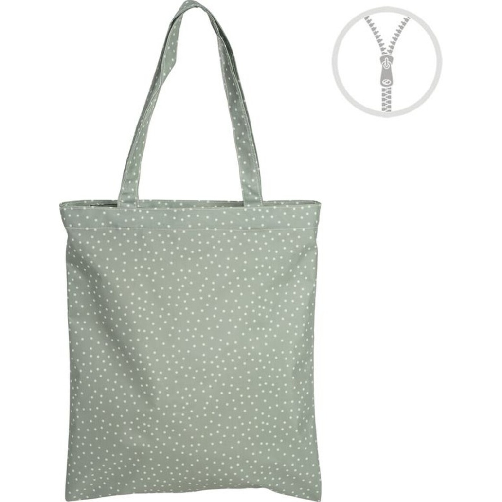 Stoffen totebag met wit-stippenprint op groene achtergrond die stijl en functionaliteit combineert. De bovenrits en de waterafstotende afwerking beschermen je spullen, terwijl de lange hengsels en het ruime interieur zorgen voor draagcomfort en gebruiksgemak. Een veelzijdig, eigentijds ontwerp dat je dagelijkse look een speels accent geeft.