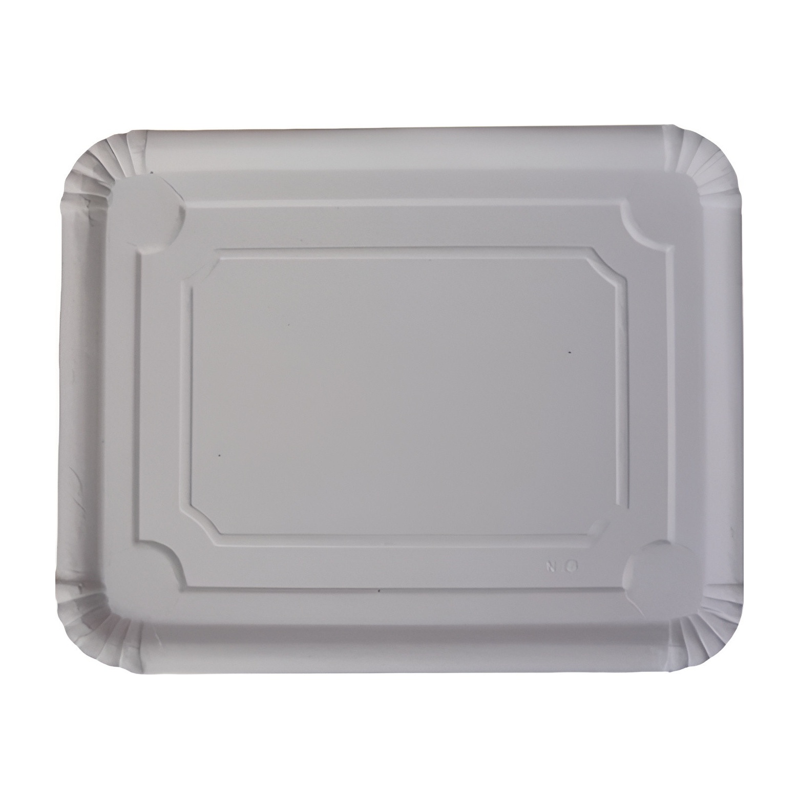 Verpakking van 50 wegwerpdienbladen van karton, model nr. 11. Afmetingen ca. 28 x 36 cm; rechthoekig ontwerp met verstevigde randen voor eenvoudig transport en nette presentatie van gerechten. Ideaal voor horeca en catering die een praktische, lichte oplossing met een professionele uitstraling zoeken.