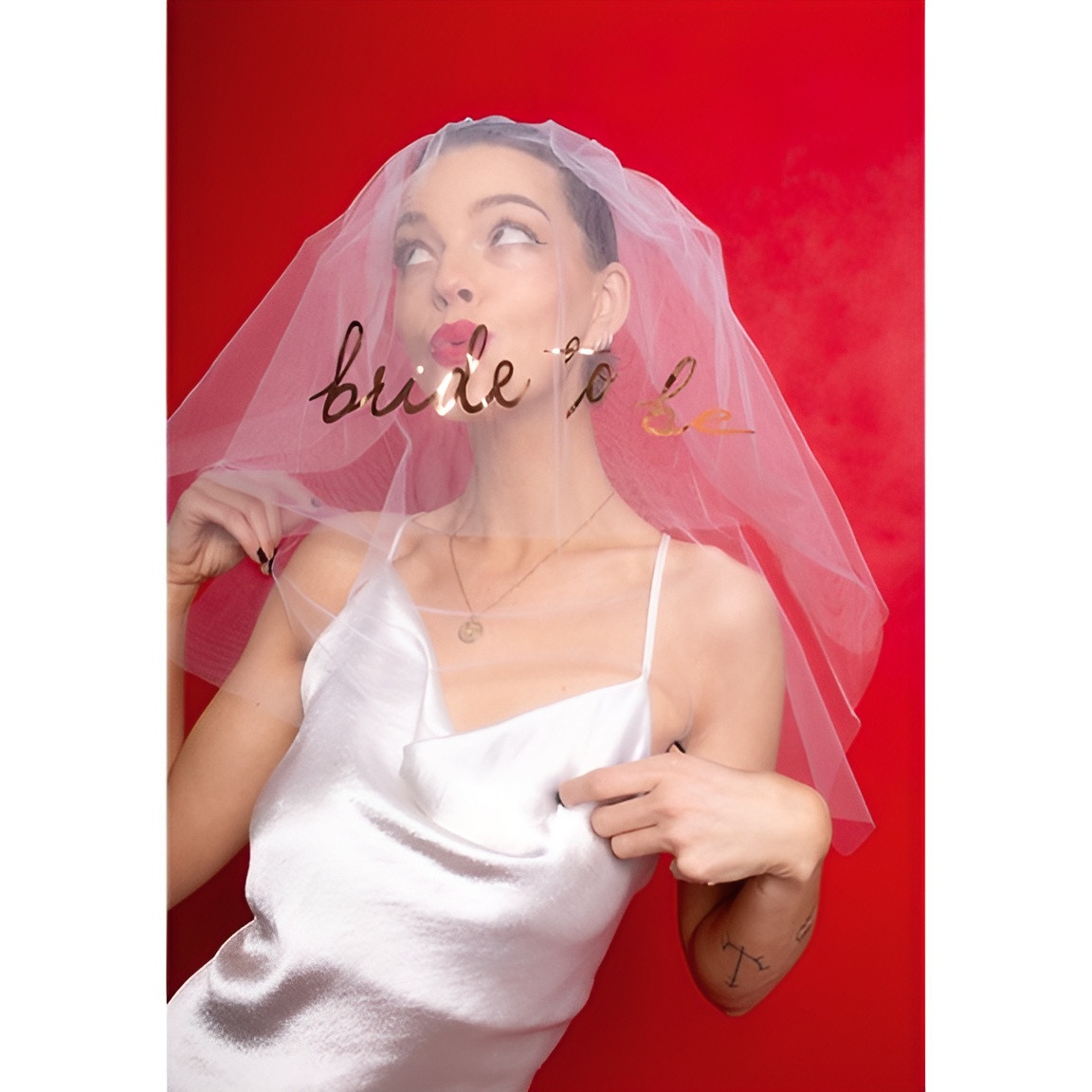 Witte sluier met het opschrift Bride to be in roségouden kleur. Ongeveer 63 cm lang voor een elegante, luchtige uitstraling. Ontwerp met dubbele laag dat volume en beweging geeft zonder zwaar te worden. Voorzien van een kam voor comfortabele en veilige bevestiging.