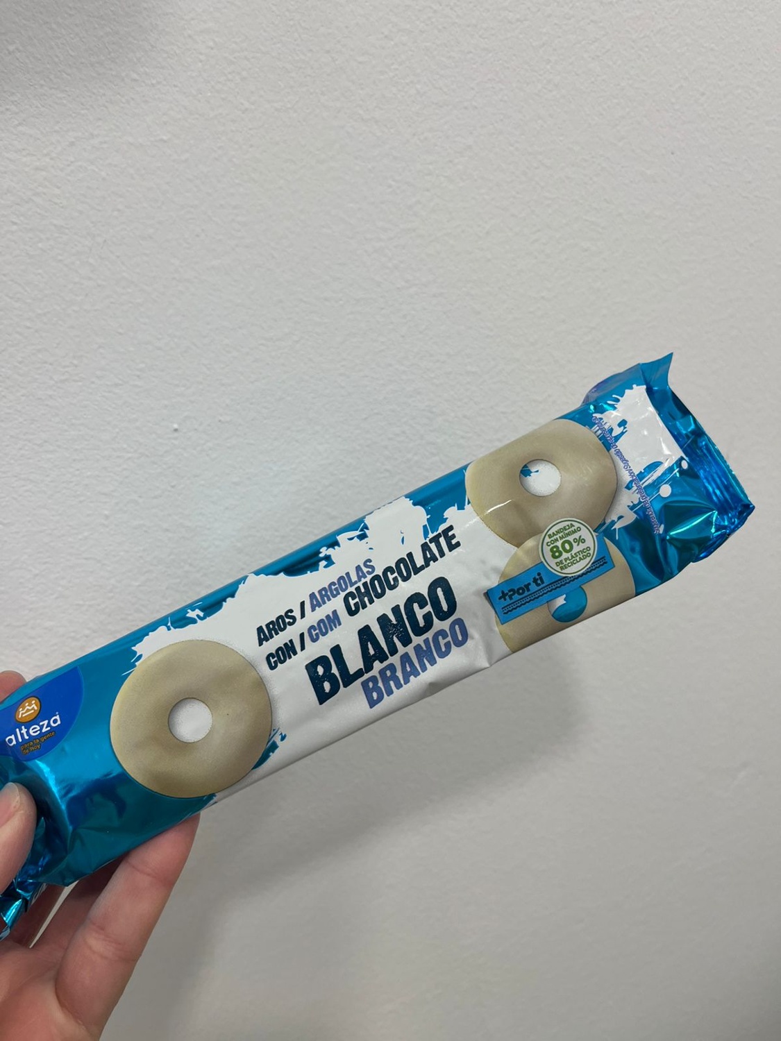 Ingrediënten: witte chocolade 43% (suiker, cacaoboter, melkpoeder, weipoeder, emulgator (sojalecithine), aroma, natuurlijk vanillearoma), tarwebloem (gluten), suiker, plantaardig vet (palm), ontvette cacaopoeder (met zuurteregelaar: kaliumcarbonaat), zout, rijsmiddelen (natriumwaterstofcarbonaat en ammoniumwaterstofcarbonaat), emulgator (sojalecithine).