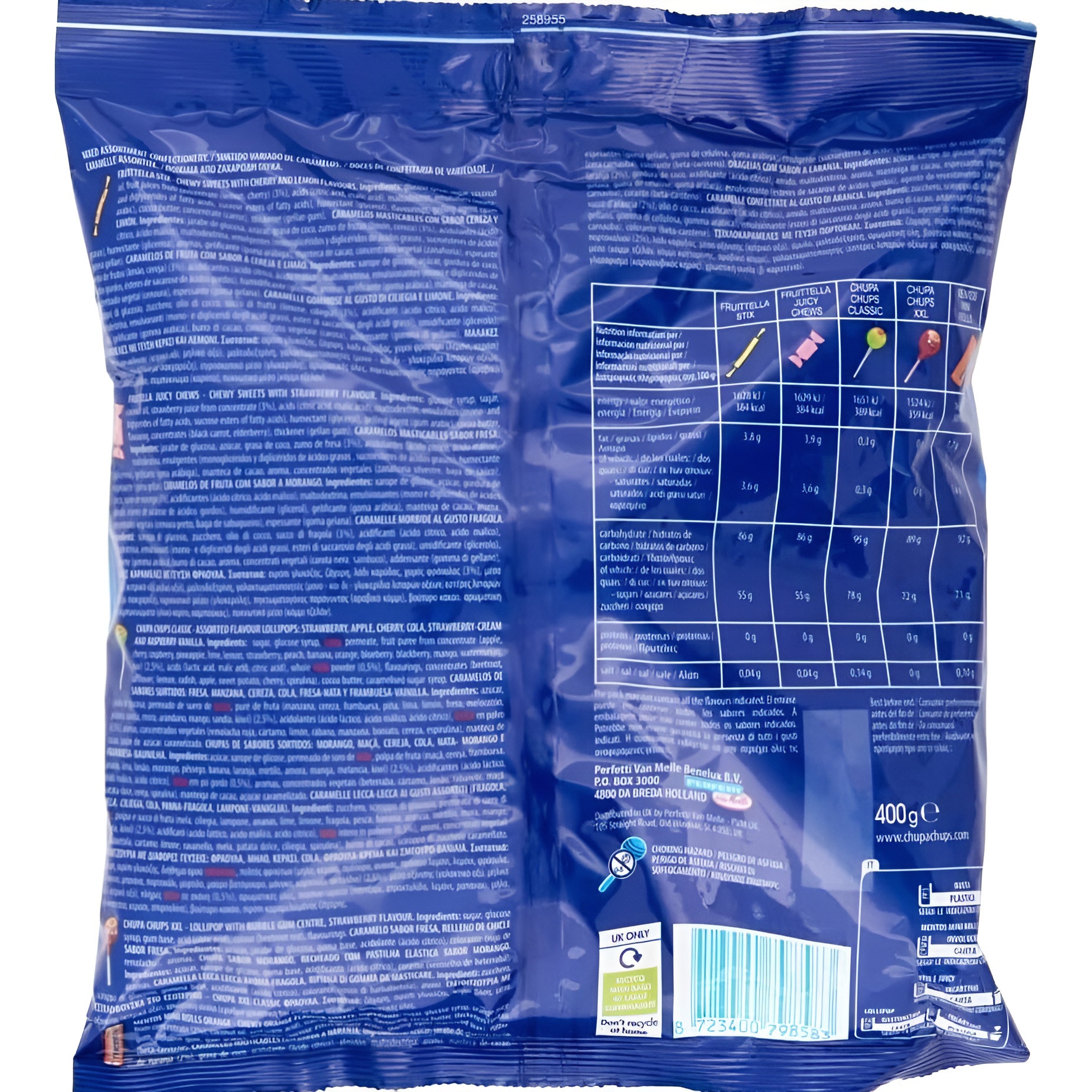- Inclusief: zachte snoepjes met kers- en citroensmaak (Fruittella Stix), zachte snoepjes met aardbeiensmaak (Fruittella Juicy Chews), Chupa Chups in diverse smaken (Chupa Chups Classic), Chupa Chups met kauwgomvulling, aardbeiensmaak (Chupa Chups chicle), Mentos met sinaasappelsmaak (Mentos Mini Rolls Orange).