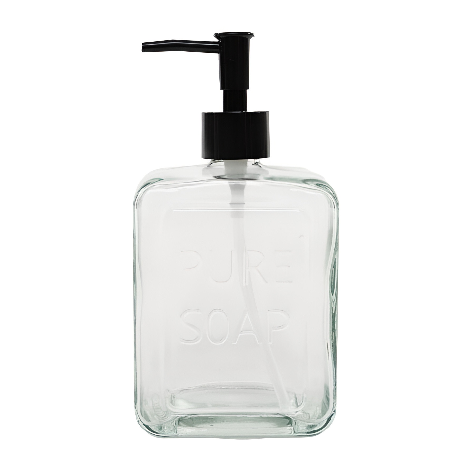 Elegante zeepdispenser met het reliëf "PURE SOAP" dat een tijdloze, decoratieve toets aan de badkamer geeft.
