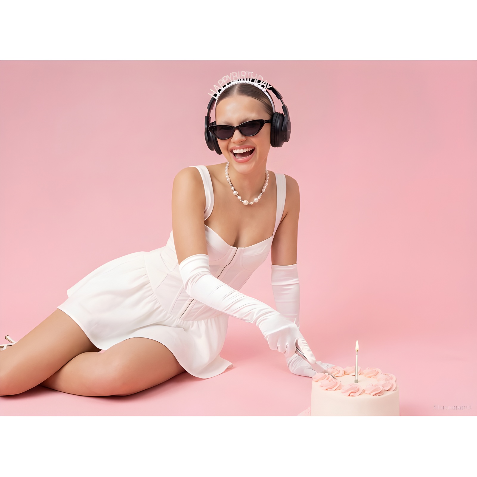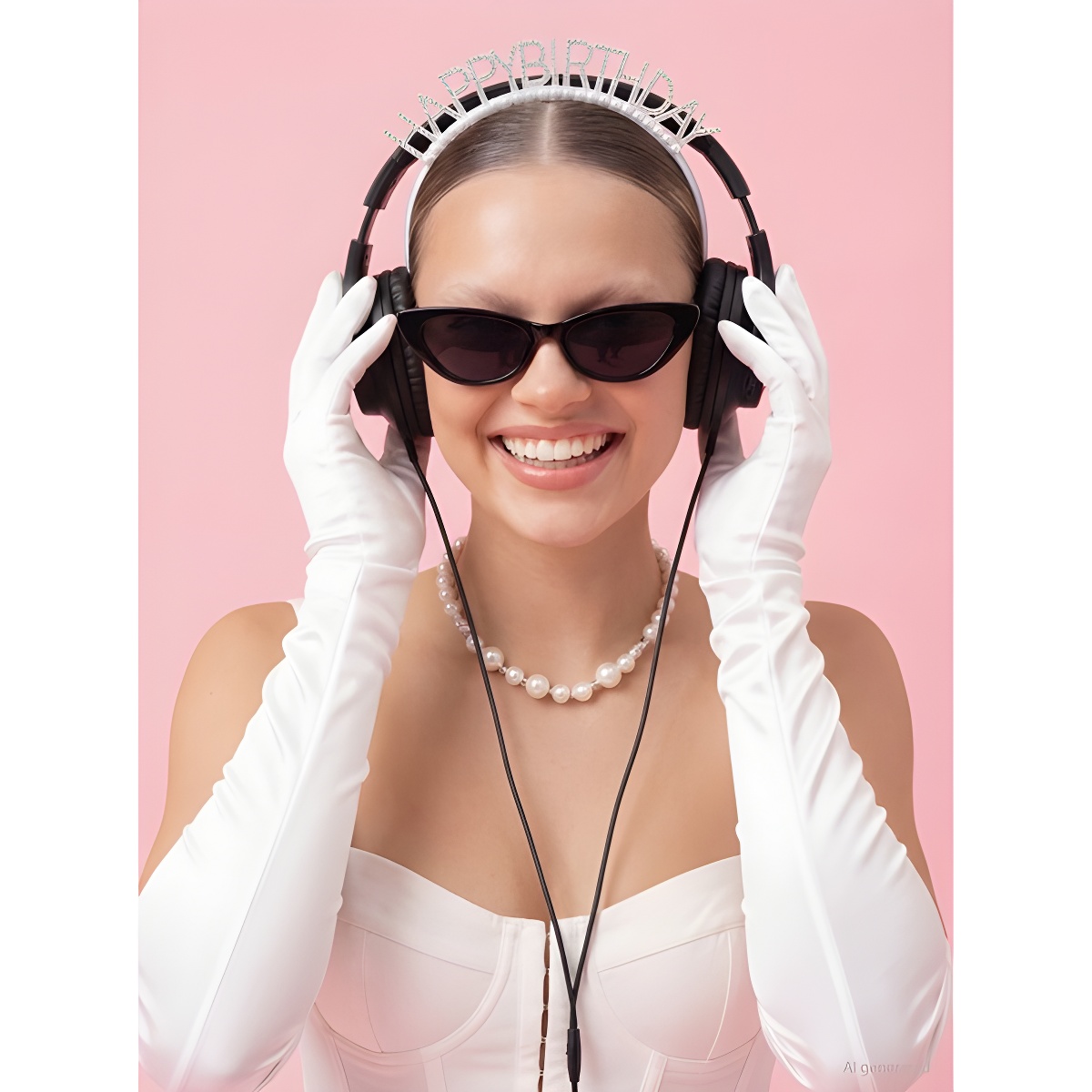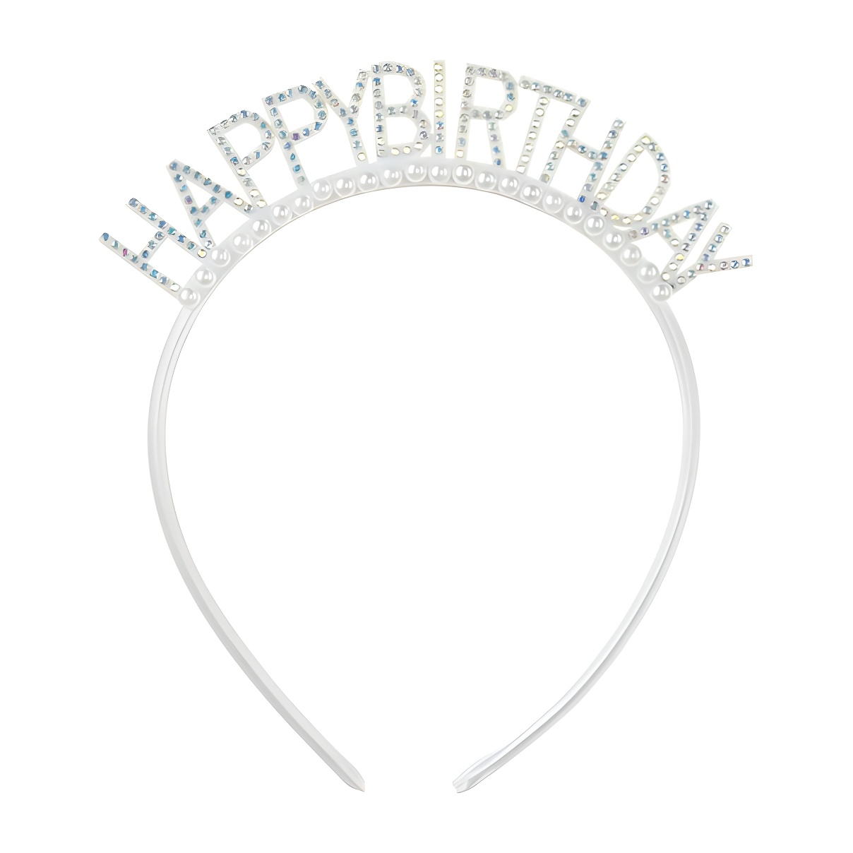 Feestelijke diadeem met de tekst "Happy Birthday" in zilveren afwerking, afgewerkt met decoratieve parels en glinsterende details.