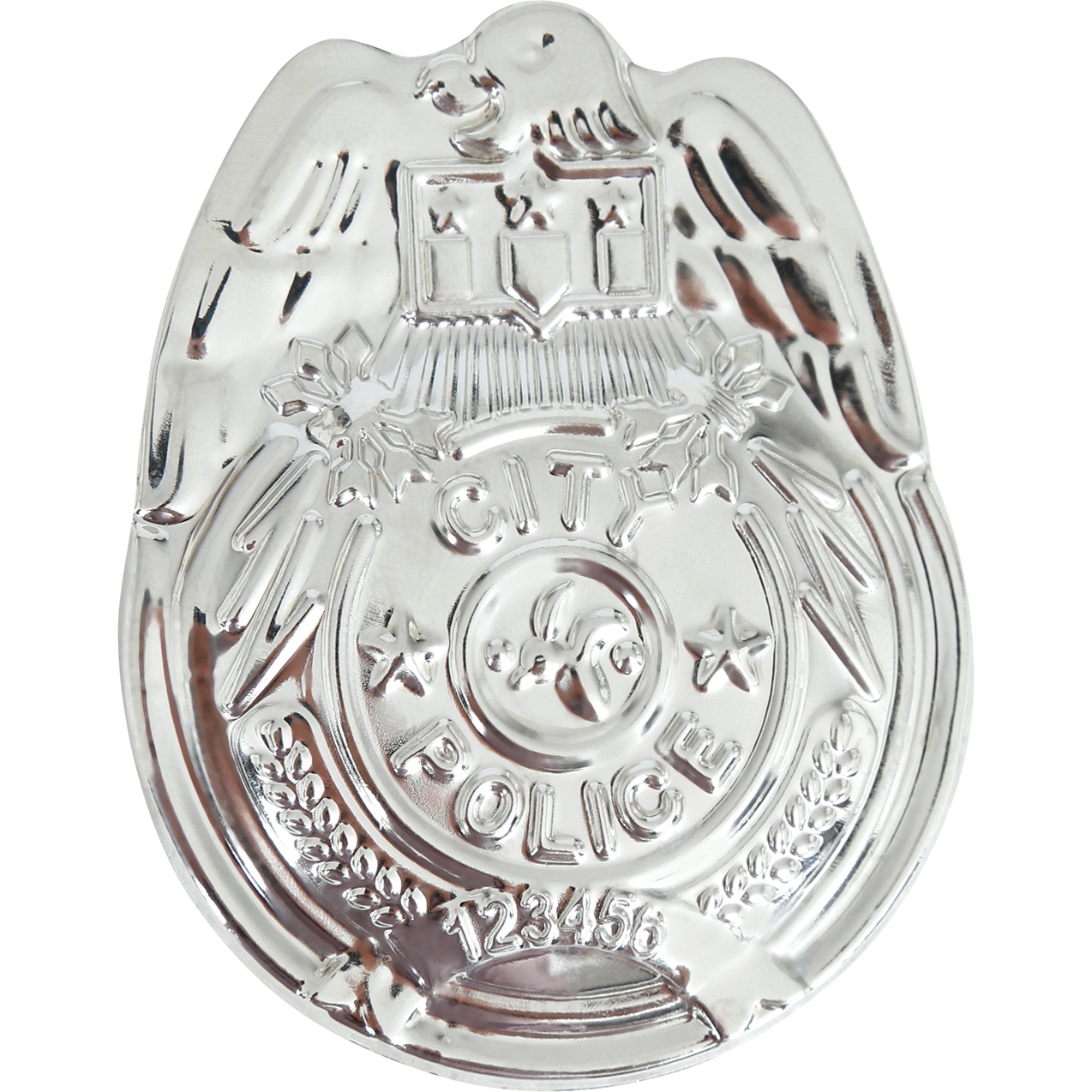 Zilveren politiebadge van 7 cm, bedoeld als aanvulling op kostuums en themafeesten. Het klassieke ontwerp en de glanzende afwerking geven rollenspellen, animaties en schoolactiviteiten een realistisch tintje. Ideaal voor carnaval en andere vieringen: een betaalbaar detail dat elke politieoutfit in enkele seconden compleet maakt.