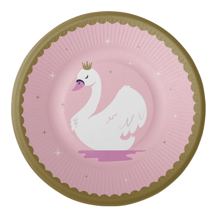 Set bestaande uit 8 roze borden met een prachtige zwaan in het midden. De rand is goudkleurig, evenals de sterren op de achtergrond en de kroon van de zwaan.