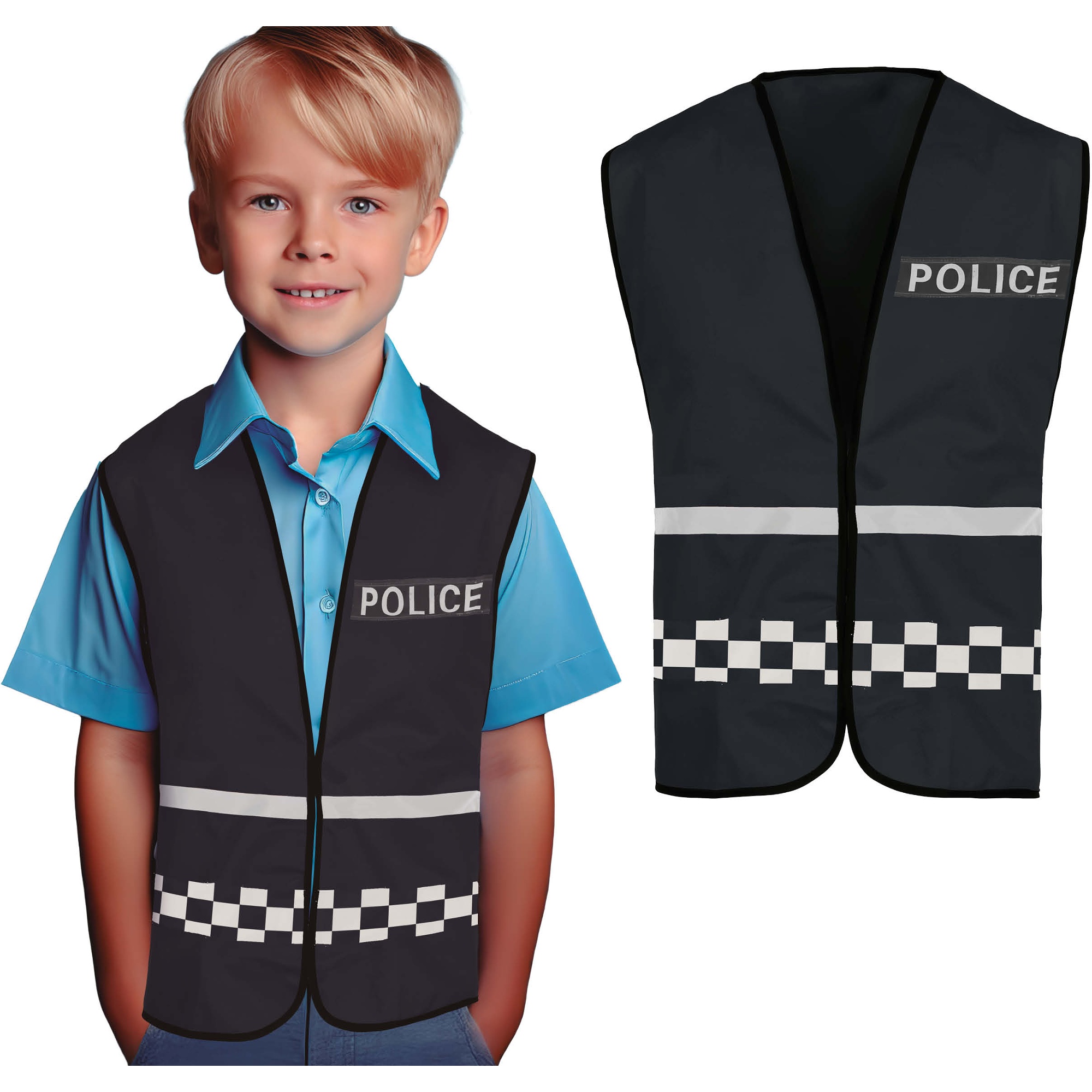 - Realistisch ontwerp met opdruk "POLICE" en reflecterende geruite banden.