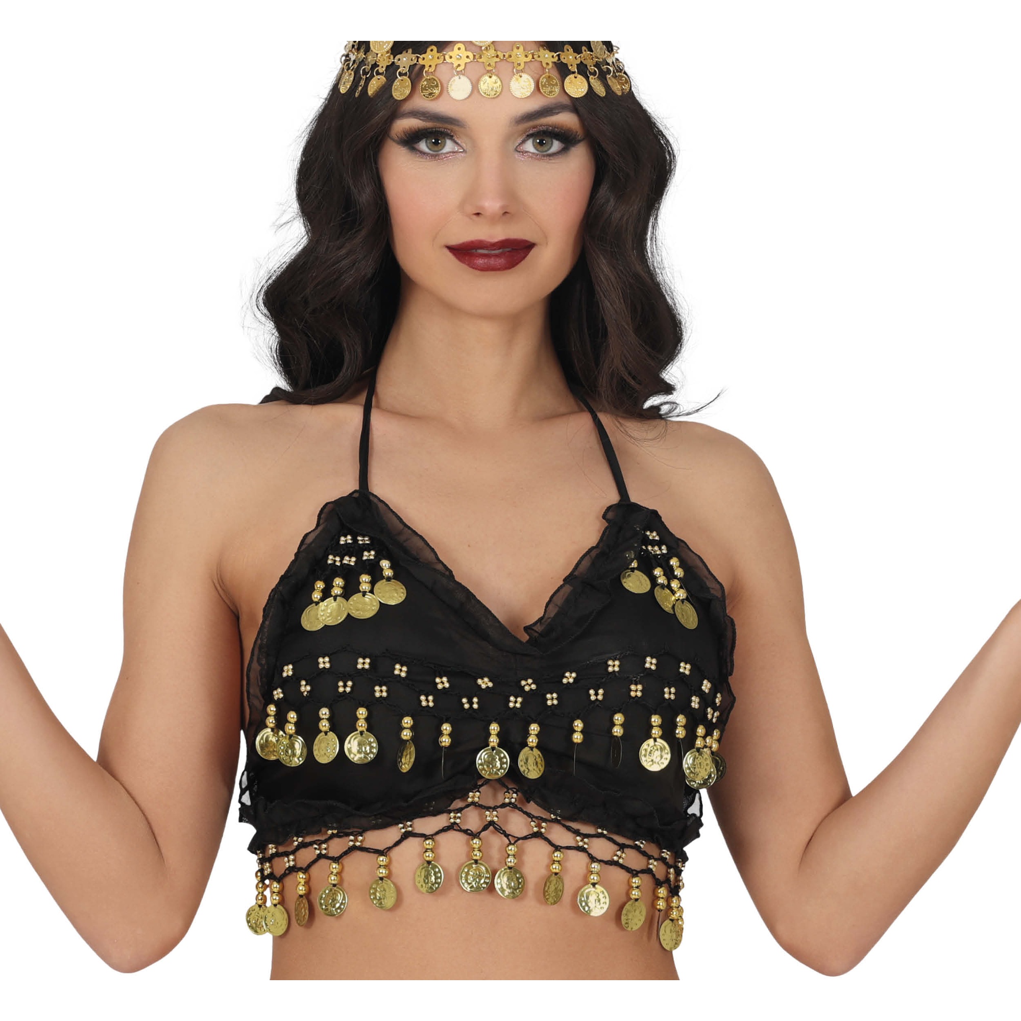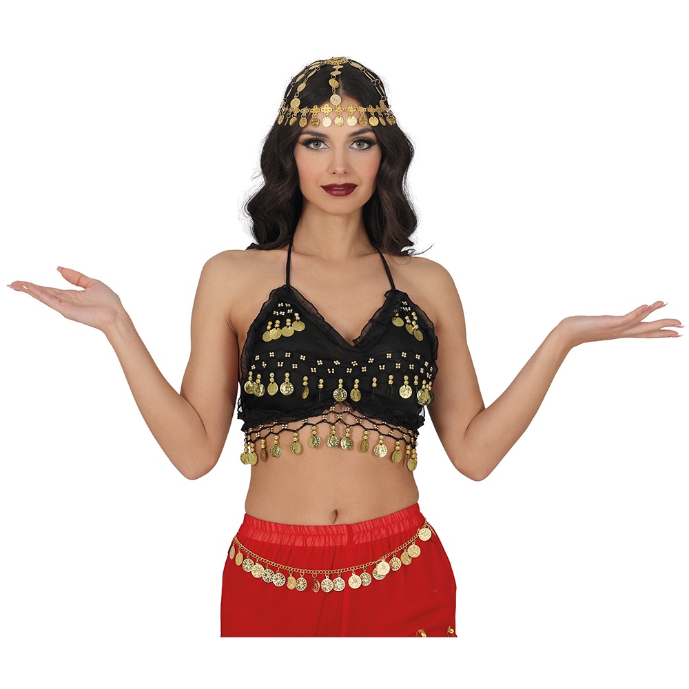 Zwarte muntentop ontworpen voor professionele buikdans en optredens. Geeft glans en beweging dankzij rijen metalen muntjes die bij elke draai rinkelen en de choreografie extra accentueren. Flatende snit met V-hals en verstelbare bandjes voor een comfortabele en veilige pasvorm. Perfect voor shows, lessen, themafeesten en carnaval; combineert moeiteloos met rokken, riemen of oosterse accessoires om de outfit compleet te maken.